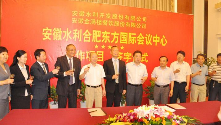 7月6日,,,安徽水利开发股份有限公司携手安徽金满楼餐饮股份有限公司签约仪式在合肥盛大举行。。。。。肥东县委书记杨宏星携县县政府、县人大、县政协及县直有关部分认真同志出席聚会,,,365英国上市党委副书记、副董事长、总司理、安徽水利董事长赵时运出席签字仪式并致辞,,,安徽水利常务副总陈圣刚出席仪式并代表公司签字,,,安徽金满楼餐饮股份董事长张青华携主要认真同志加入了聚会。。。。。