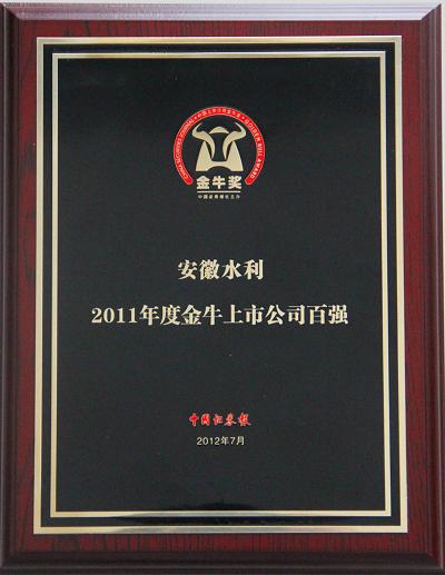 7月7日,,,,,中国证券报第14届(2011年度)“上市公司金牛奖”颁奖活动在天津盛大举行,安徽水利荣获“2011年度金牛上市公司百强”声誉称呼,,,,,并以综合实力位列百强榜第58位,这是安徽水利首次获得该项殊荣。。。。。。