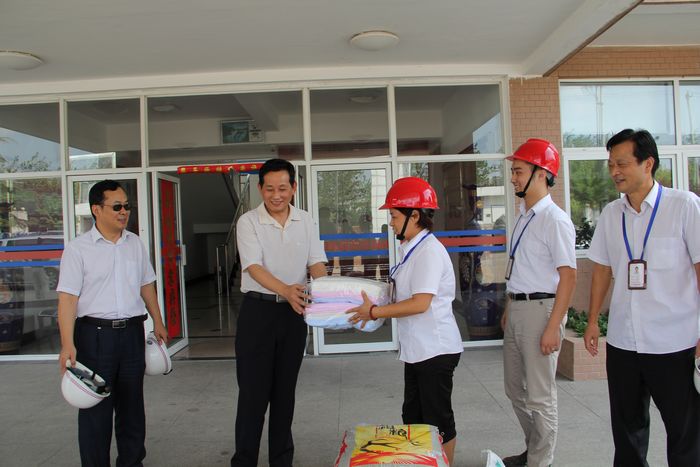 8月1日下昼,,,,烈日炎炎,,,,酷暑难耐。。集团公司工会主席、纪委书记牛曙东在集团工会副主席吴晓伍、女工部主任胡爱红陪同下,,,,风尘仆仆地来到安徽建机公司,,,,探望慰问奋战在生产一线的员工,,,,并送来了许多消暑日用品及绿豆、白糖等。。