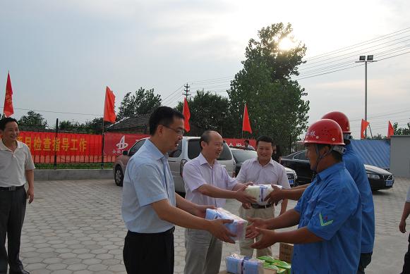 7月17日,,365英国上市公司董事长、党委书记赵时运,,在副董事长、党委副书记李长斌,,纪委书记、工会主席牛曙东等同志的陪同下,,到省路桥公司合肥市G206公路改365英国上市程项目部,,深入工地,,探望慰问施工一线的职工,,相识工程希望情形,,征询宽大一线职工的意见,,并给他们送去了防暑降温用品。。。