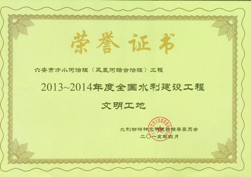 近期,,,水利部精神文明建设指导委员会转达了天下水利建设工程文明工地评选效果,,,安徽水利一公司承建的六安市方小河治理(凤凰河综合治理)工程(以下简称凤凰河工程)被评定为“20132014年度天下水利建设工程文明工地”。。。