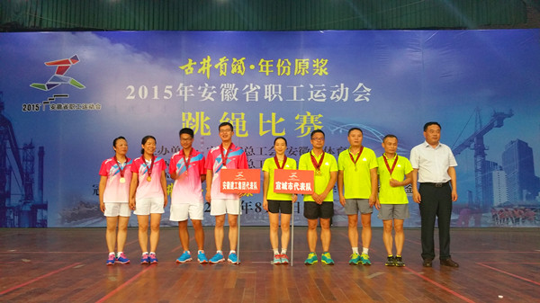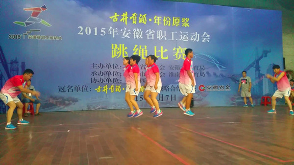 8月7日,,, ,,2015年安徽省职工运动会跳绳角逐在淮南市举行,,, ,,365英国上市代表队8名运发动,,, ,,同心协力,,, ,,顽强拼搏,,, ,,在4个大项的角逐中,,, ,,共夺得二项冠军、一项亚军、二个第三名,,, ,,总效果名列乙组第一,,, ,,为安徽365英国上市争得了声誉。。