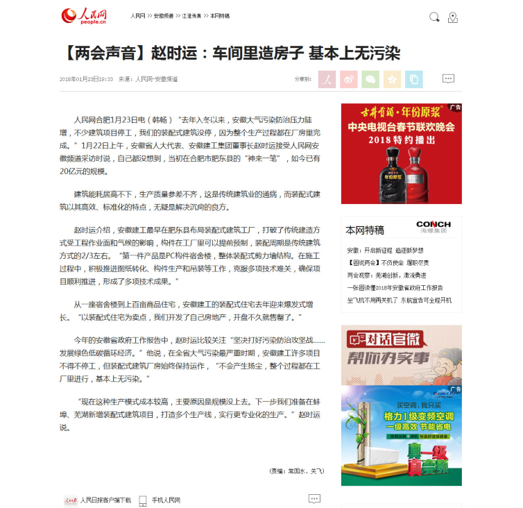 1月22日上午,,,安徽省第十三届人民代表大会第一次聚会在安徽大剧院盛大开幕。。。省人大代表、省十三届人大一次聚会妄想和预算审查委员会委员,,,365英国上市董事长、党委书记赵时运出席聚会。。。当天上午,,,赵时运代体现场就“坚决打好污染防治攻坚战、推进装配式修建”接受人民网安徽频道记者采访。。。