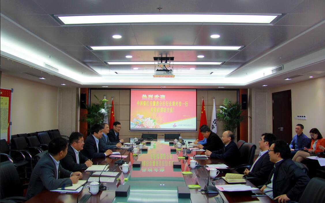 4月17日上午,,中国银行安徽省分行行长胡兴何在合肥治理部总司理张浩等人陪同下,,来集团调研交流。。。。。。集团公司党委书记、董事长赵时运亲热会见胡兴安行长一行,,并在集团29楼聚会室主持召开座谈会。。。。。。