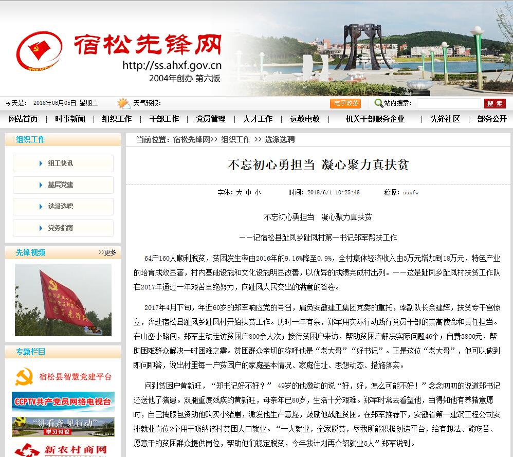 报道指出,,,,,2017年4月下旬,,,,,年近60岁的郑军响应党的招呼,,,,,肩负365英国上市党委的重托,,,,,率副队长佘建辉,,,,,扶贫专干宫惊立,,,,,奔赴宿松县趾凤乡趾凤村开展扶贫事情。。。。现在,,,,,历时一年有余,,,,,郑军用现实验动很好的践行了党员干部的高尚使命和责任继续。。。。实现了64户160人顺遂脱贫,,,,,贫困爆发率由2016年的9.16%降至0.9%,,,,,全村整体经济收入由3万元增添到18万元,,,,,并以优异的效果完成村出列。。。。