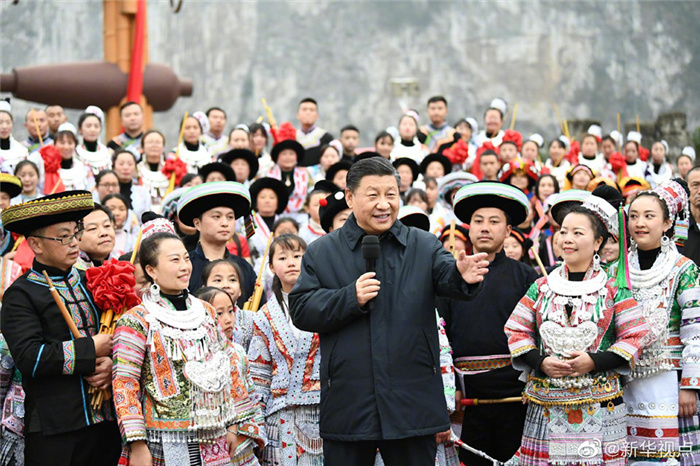 春节前夕,,,,,,习近平总书记赴贵州考察调研并探望慰问下层干部群众。。。3日下昼,,,,,,他来到毕节市黔西县,,,,,,实地观察乌江六冲河段生态情形,,,,,,走进新仁苗族乡化屋村探望乡亲们。。。在村文化广场,,,,,,习近平同加入少数民族春节民俗活动的群众亲热交流,,,,,,并向天下各族人民致以新春祝福。。。