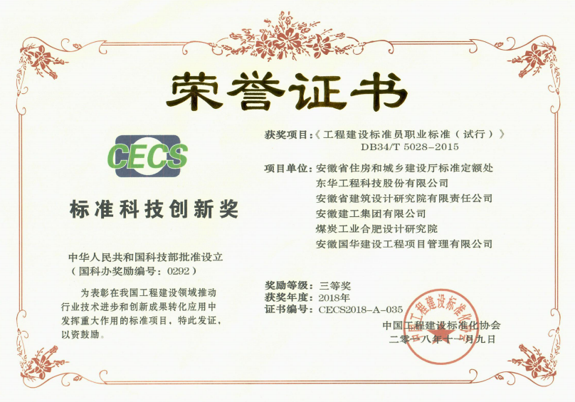 克日,,,,,,凭证《中国工程建设标准化协会关于标准科技立异奖评选效果的通告》(建标协函〔2018〕53号),,,,,,365英国上市联合各单位主编完成的安徽省地方标准《工程建设标准员职业标准(试行)》(DB34/T 5028-2015)获得了中国工程建设标准化协会的“标准科技立异奖”三等奖。。。。。