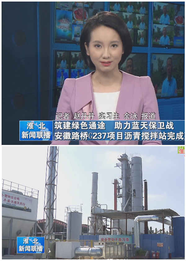 8月31日晚,,,,,,《淮北新闻联播》栏目以《筑建绿色通途 助力蓝天守卫战》为题,,,,,,报道了安徽路桥公司G237项目顺遂完成沥青拌杂站废气治理使命,,,,,,将绿色、环保、文明施工落到实处,,,,,,以现实验动助力淮北市打赢蓝天守卫战。。