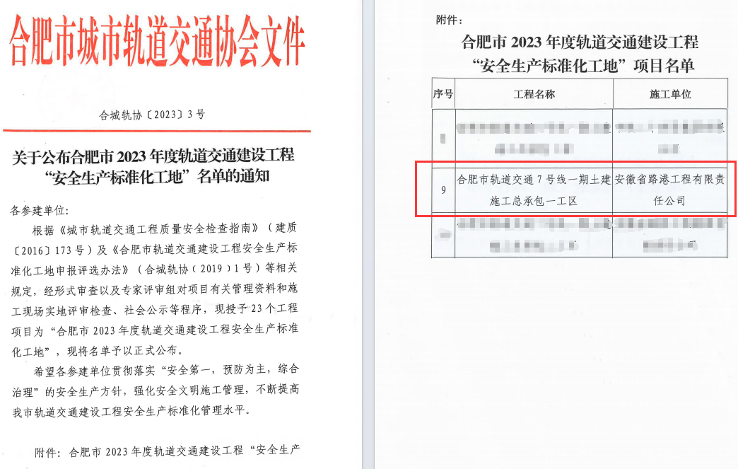 近日,,安徽365英国上市路港建设集团有限公司合肥市轨道交通7号线项目荣获合肥市2023年度轨道交通建设工程“清静生产标准化工地”称呼。。。。