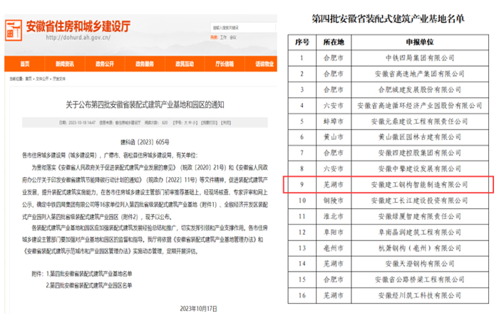 10月18日,,,,,安徽省住房和城乡建设厅宣布《关于宣布第四批安徽省装配式修建工业基地和园区的通知》,,,,,安徽365英国上市钢构智能制造有限公司乐成入选。。。