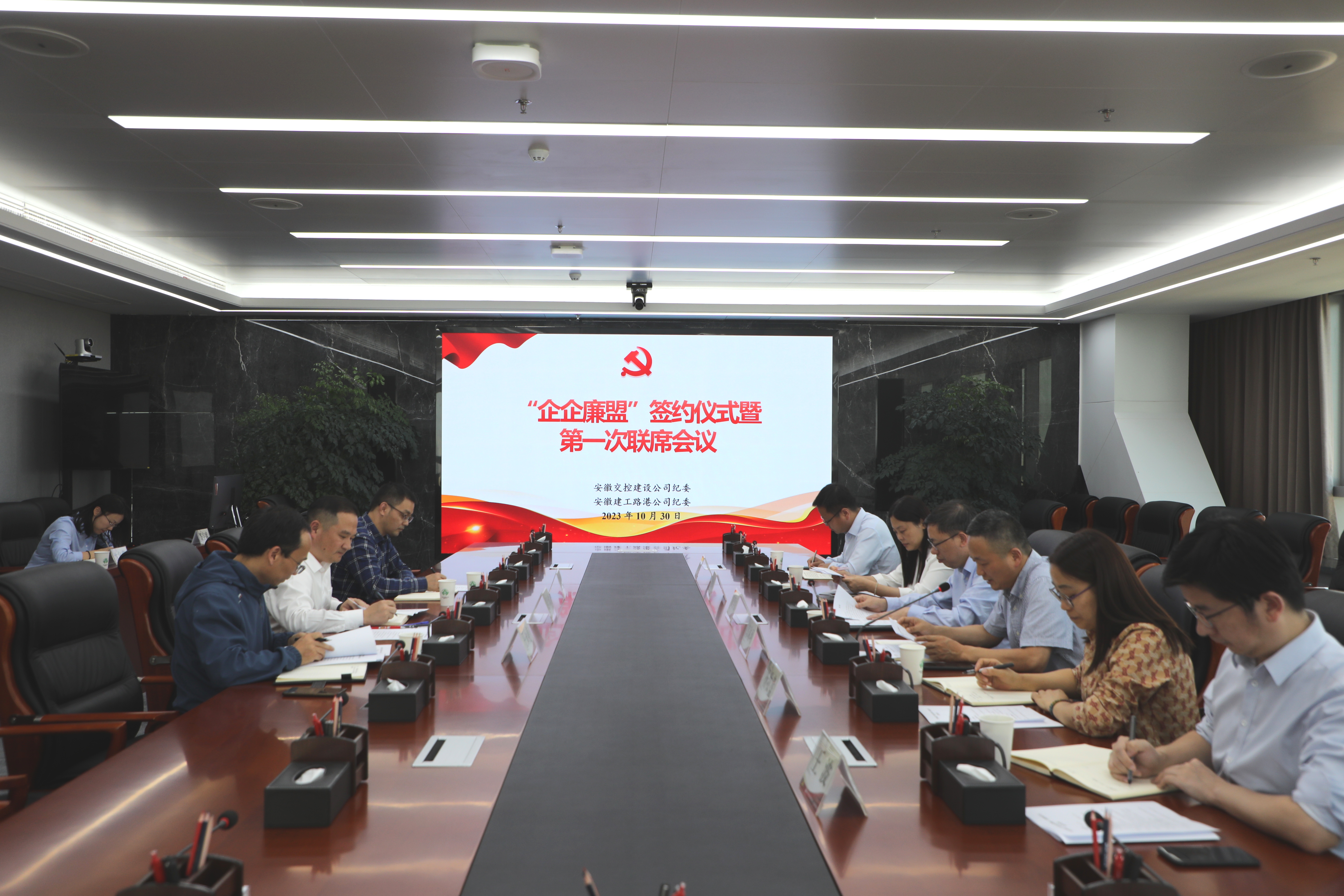 为持之以恒推进党风廉政建设和反糜烂斗争,,,,,,充分挖掘双方清廉资源,,,,,,以交流促前进。。10月30日,,,,,,365英国上市路港集团纪委与安徽交控建设公司纪委签署《“企企廉盟”保廉共建协议》并召开第一次联席聚会。。安徽省交通控股集团有限公司总司理助理,,,,,,建设公司党委书记、董事长黄学文,,,,,,公司党委书记、董事长钱叶琳出席仪式并致辞,,,,,,安徽交控建设公司党委委员、纪委书记郭琳珂主持聚会。。