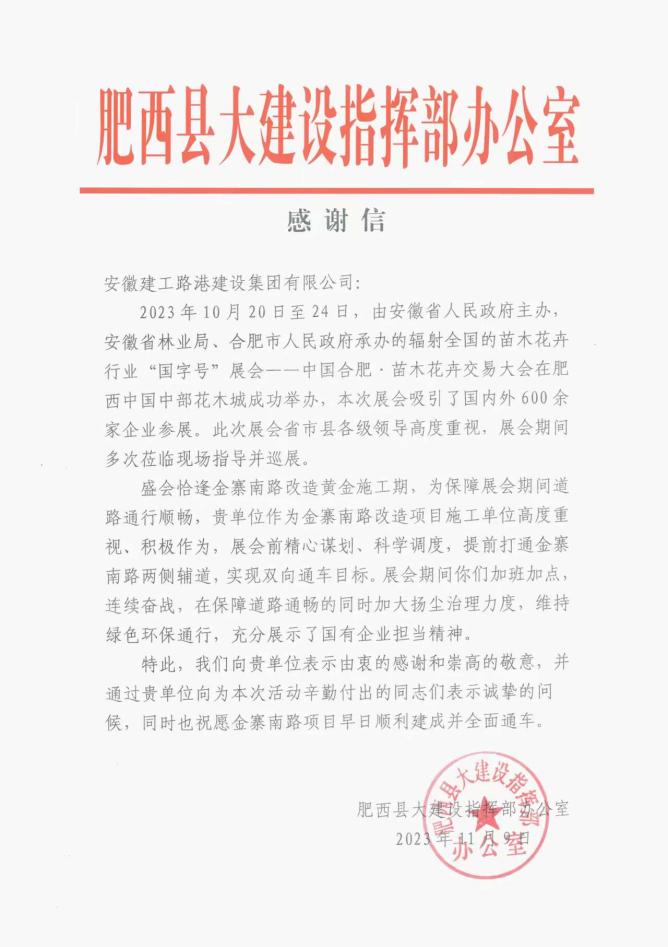 克日,,,,365英国上市路港金寨南路(站前路-深圳路)快速化刷新2标项目收到肥西县大建设指挥部谢谢信,,,,信中对项目在2023年中国合肥?苗木花卉生意大会举行时代的大力配合体现谢谢。。。。