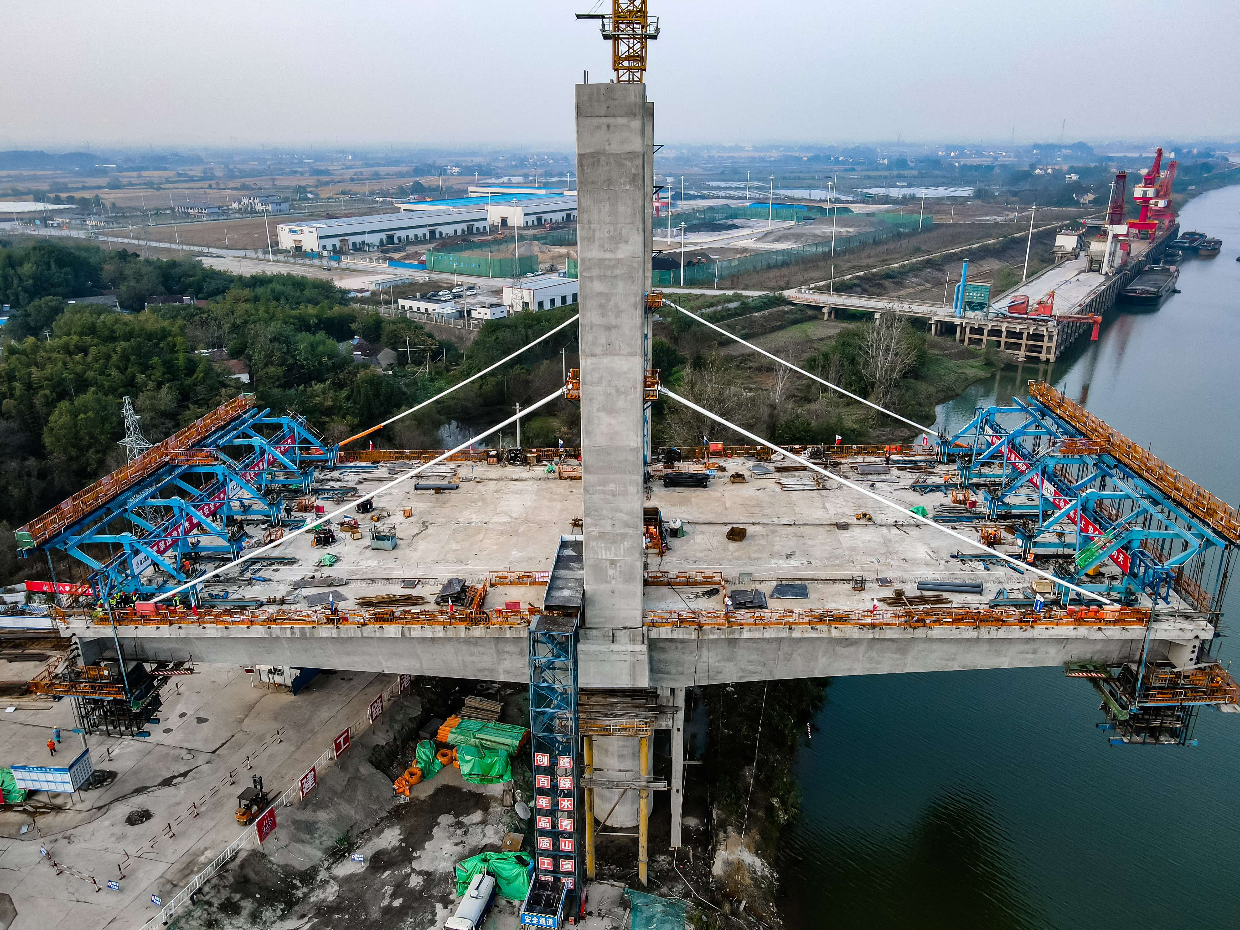 在此次装置的首对斜拉索中,,,,,单根长度92.027m,,,,,重量为113.72kg。。。斜拉索的装置施工历程包括预埋管装置、挂索、张拉、调索等几个工序。。。首对斜拉索的乐成装置,,,,,标记着水阳江特大桥施工进入了新的阶段,,,,,为后续的拉索区顺遂施工打下了坚实基础。。。