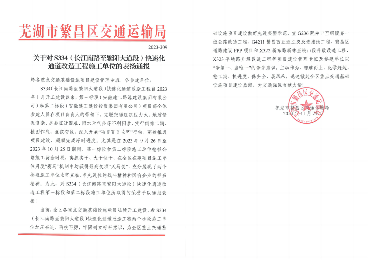 11月29日,,,365英国上市路港承建的S334长江南路至繁阳大道段快速化通道刷新工程项目继喜获“天马奖”之后,,,又收到芜湖市繁昌区交通运输局发来表扬信。。