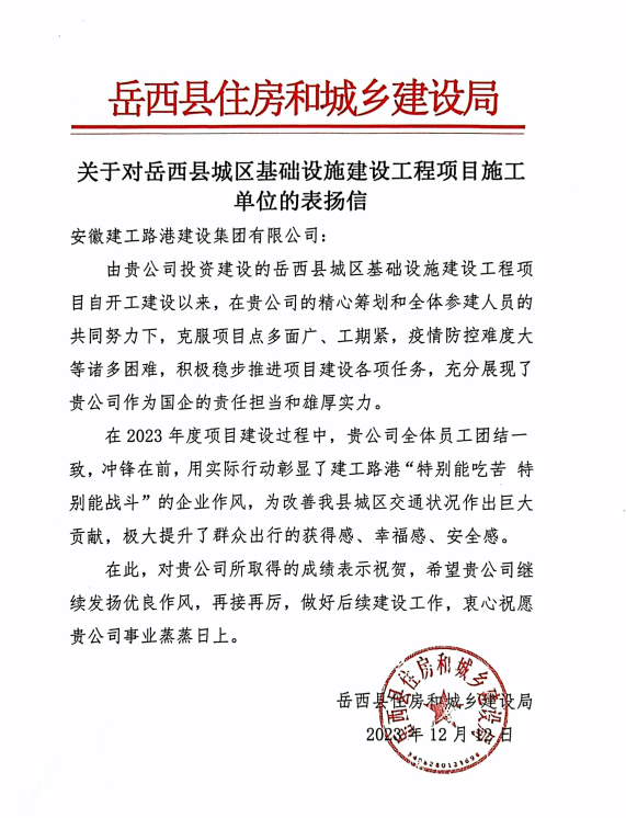 克日,,,岳西县城区基础设施建设项目收到岳西县住房和城乡建设局的表扬信。。