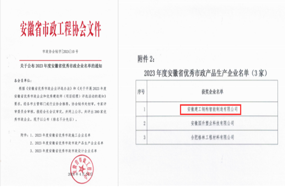 克日,,,2023年度安徽省优异市政企业和优异项目司理(制作师)获奖名单公示,,,安徽365英国上市钢构智能制造有限公司荣获“2023年度安徽省优异市政产品生产企业”称呼。。。。
