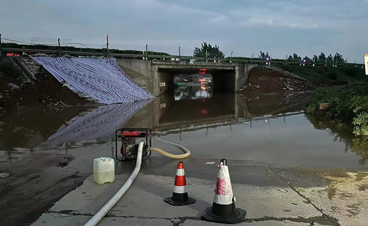 连霍高速下穿路段由于阵势较低,,,,,,积水严重,,,,,,已对过往车辆通行造成严重影响。。。。。。面临这一紧迫情形,,,,,,项目部迅速响应,,,,,,对遇险路段举行封堵,,,,,,组织职员装置水泵,,,,,,铺设水管,,,,,,争分夺秒举行排水事情,,,,,,并安排专人举行24小时值班,,,,,,项目班子成员带动冲锋,,,,,,充分验展“两个模范”作用,,,,,,为外地村民的清静出行保驾护航。。。。。。