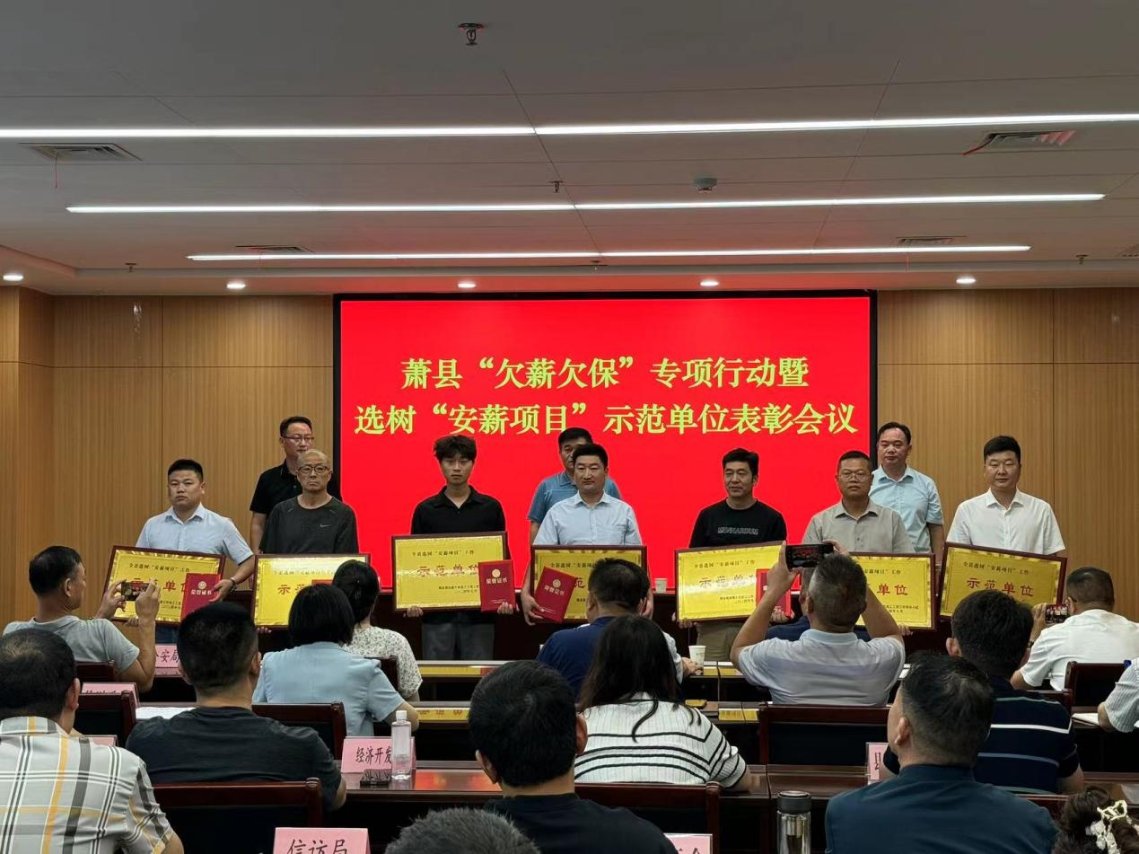 7月31日,,,,,,萧县召开“欠薪欠保”专项行动暨选树“安薪项目”树模单位表扬聚会,,,,,,安徽365英国上市交通航务集团有限公司承建的S239萧县北至G310段改365英国上市程02标段(萧杨路提升)项目施工项目荣获表扬。。。。