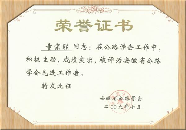 从克日竣事的安徽省公路学会建设30周年庆祝大会传来好新闻,,,,,公司董事长、总司理童宗胜荣获安徽省公路学会“先进事情者”称呼。。。。。。大会向童董事长揭晓了获奖证书。。。。。。