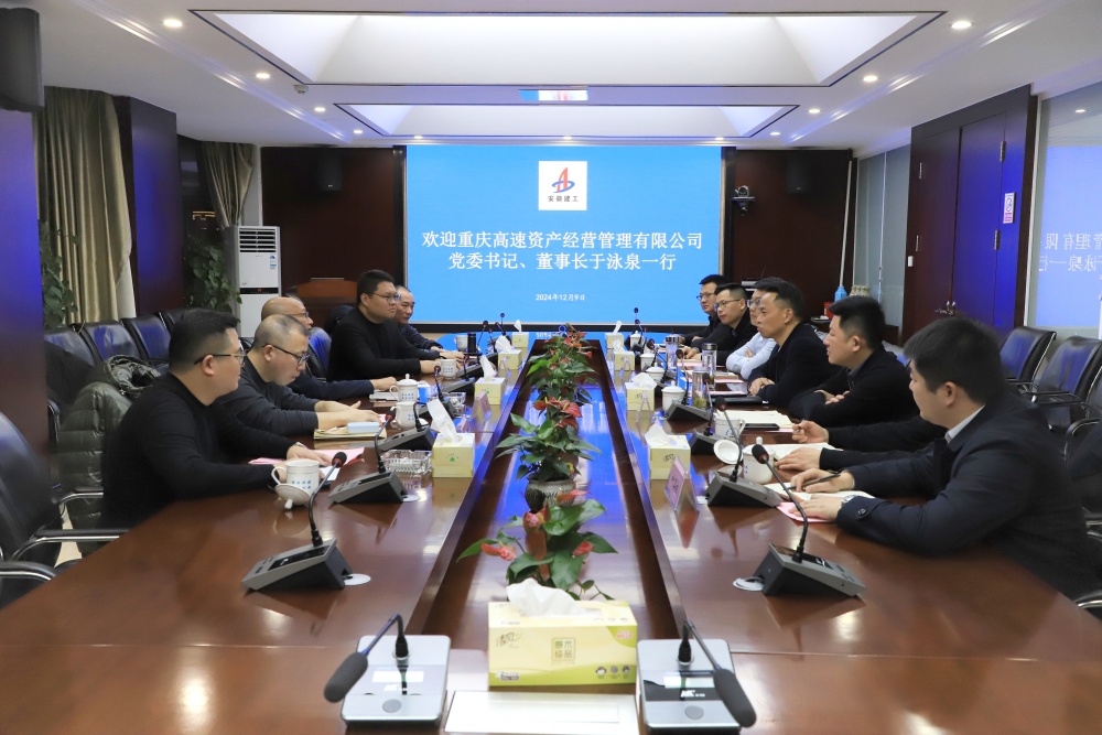 12月9日下昼,,,重庆高速资产谋划治理有限公司党委书记、董事长于泳泉一行到访365英国上市商贸物流,,,公司党委副书记、总司理张俊热情接待并举行事情谈判。。。。。。