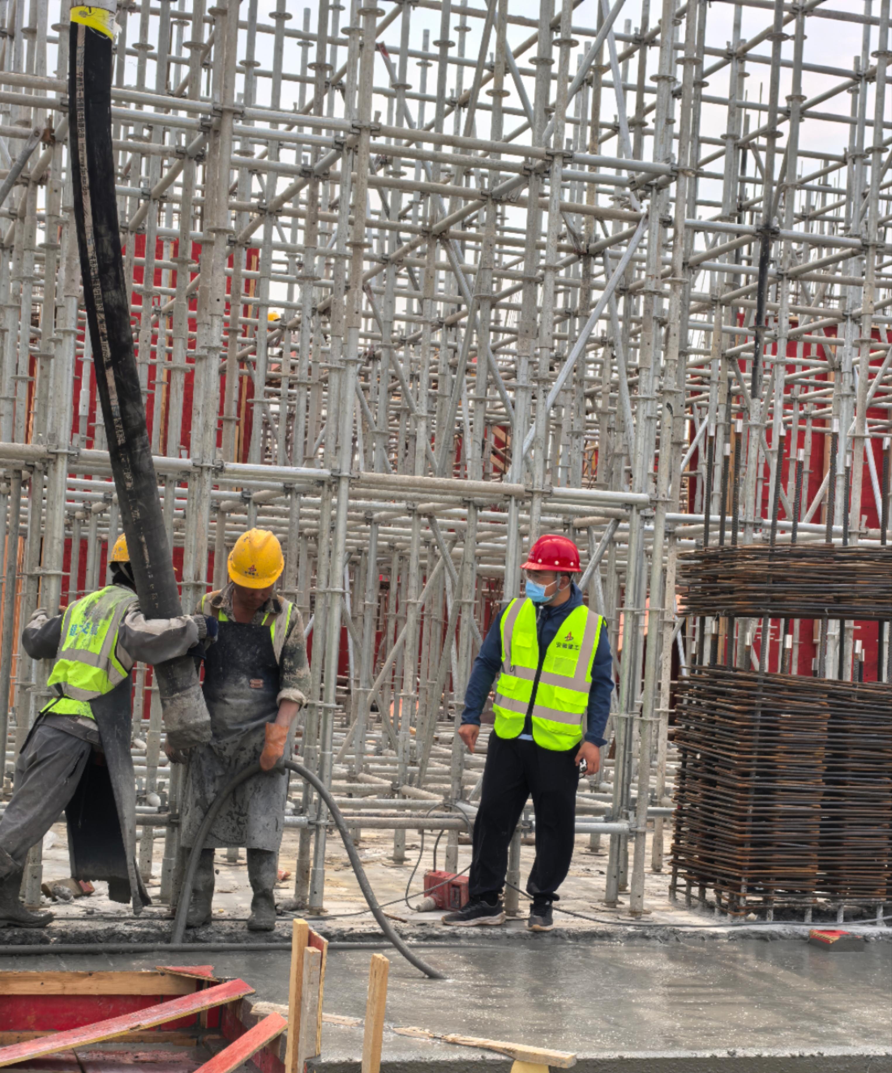 正值施工黄金期,,,阜阳智谷工业园(B)区项目施工现场如火如荼。。。。。项目工程治理部认真人宋朝望坚守一线,,,在混凝土浇筑作业面上,,,他忙碌的身影格外显眼。。。。。宋朝望认真指挥现场工人规范操作,,,详细纪录浇筑方量与时间,,,严酷把控混凝土浇筑质量,,,在包管施工清静的同时,,,全力推进进度,,,确保项目按妄想有序推进。。。。。