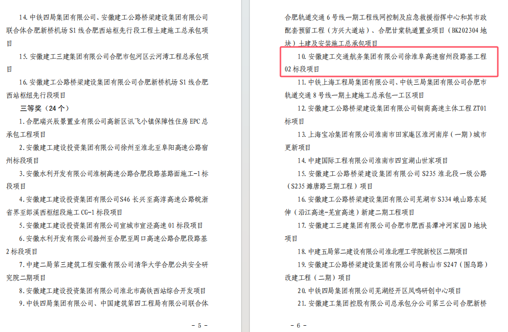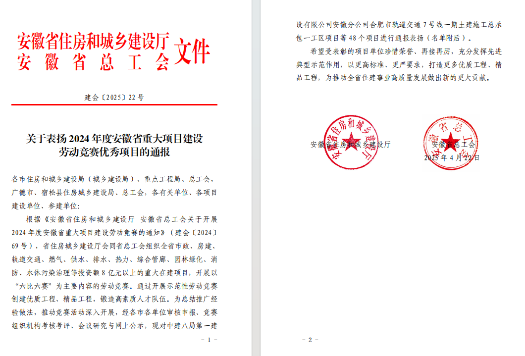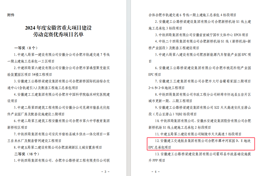 克日,,安徽省住房和城乡建设厅、安徽省总工会联合宣布《关于表扬 2024 年度安徽省重大项目建设劳动竞赛优异项目的转达》,,公司潭冲河家园 D、E 地块 EPC 总承包项目和徐淮阜高速宿州段路基工程 02 标项目体现突出,,乐成入选优异项目名单。。。。。。