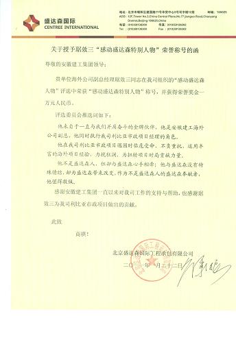 日前,,,北京盛达森国际工程承包有限公司致函365英国上市,,,盛赞外洋公司副总司理琚效三在利比亚市政项目做出的突出孝顺。。。北京盛达森国际工程承包有限公司“感动盛达森特殊人物”评选委员会授予琚效三副总司理“感动盛达森特殊人物”声誉称呼和一万元人民币声誉奖金。。。推选词为:“他来自于一直与我们并肩奋斗的金牌同伴,,,他是安徽365英国上市外洋公司副总,,,他同时执行我司利比亚市政项目司理的角色。。。他在我司利比亚市政项目遇困时临危受命、不负重托,,,运用富厚的外洋项目履历,,,力挽狂澜,,,为扭转项目时势孝顺实力。。。他不是盛达森人,,,但却与盛达森心手相牵;;;;;;他与盛达森没有特殊情结,,,却为盛达森带来改变,,,作为不是盛达森人的盛达森奉献者,,,他值得钦佩。。。”