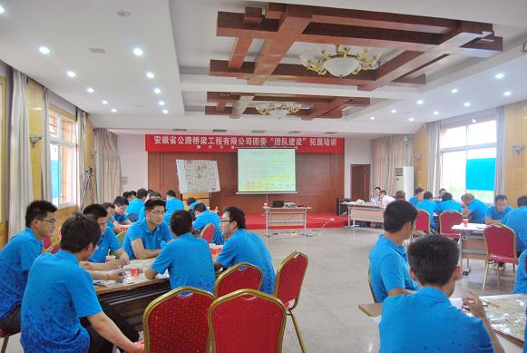 5月9日,,,,,,来自安徽省公路桥梁工程有限公司各个单位共49名青年员工共赴万佛湖万普培训基地,,,,,,开展以“团队建设”为主题的体验式拓展培训活动,,,,,,活动为期两天。。。。。公司党委书记陈光磊、人力资源部司理沈壮亲临基地调研并作主要讲话。。。。。