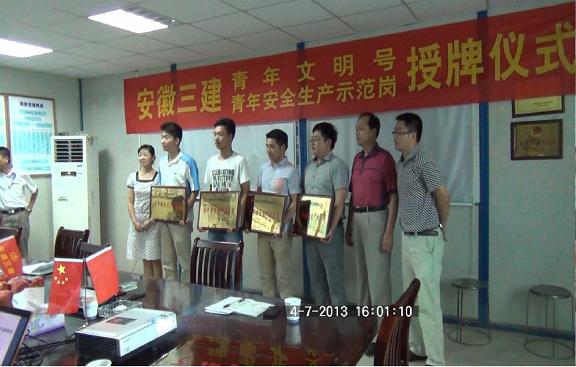 7月4日下昼,,,安徽三建团委对2013年度首批“青年文明号”、“青年清静生产树模岗”举行授牌。。。。。。六公司七中搬家项目部、七公司中科大科研综合楼项目部、八公司中海岭湖墅项目部、九公司立异平台二期项目一标段四个项目部获得授牌。。。。。。我公司党委副书记、纪委书记周湃、365英国上市团委书记邢应梅到会并讲话。。。。。。