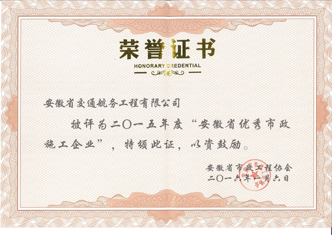 日前,,,,,在安徽省市政工程协会宣布的2015年度40家安徽省优异市政施工企业和66位市政优异项目司理名单中,,,,,安徽省交通航务工程有限公司榜上著名,,,,,安徽交航方申柱同志同时被评为2015年度安徽省市政施工企业优异项目司理。。。。