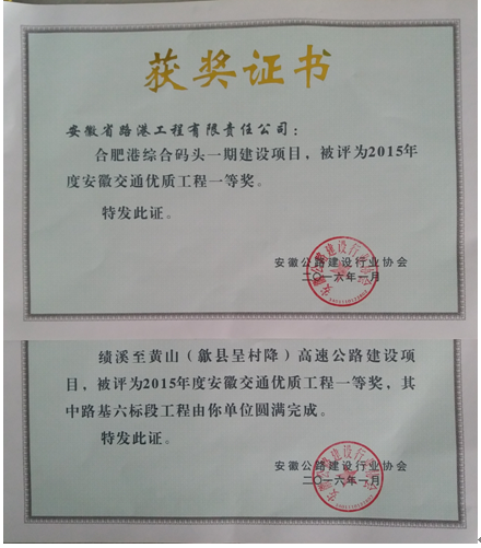克日传来好新闻,,,,,,由安徽路港公司承建的绩溪至黄山(歙县呈村降)高速公路工程、合肥港综合码头一期工程荣获2015年度安徽省交通优质工程一等奖。。。。