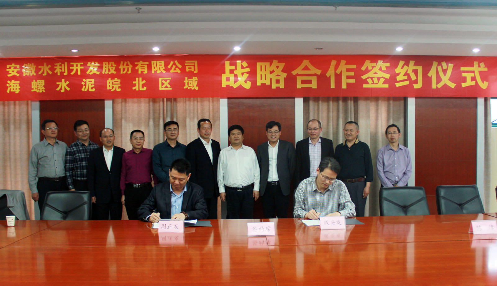 4月25日,,安徽水利与海螺水泥皖北区域在蚌埠签署战略相助协议。。。。海螺水泥皖北区域主任周正友,,销售部部长助理杨辉及皖北各地区认真人,,安徽水利副总司理成安发及相关部分认真人出席签约仪式。。。。成安发与周正友划分代表安徽水利和海螺水泥皖北区域配合签署了战略相助协议。。。。